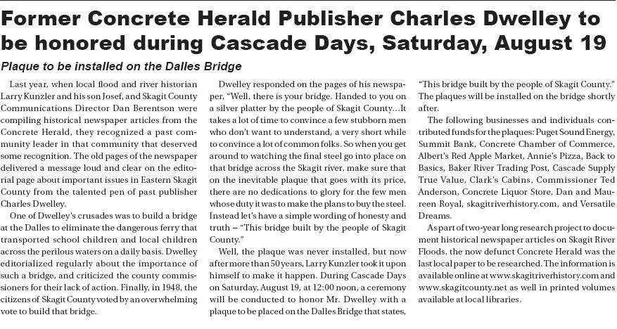 "The campaign to get a bridge built connecting the two sides of the area can be chalked up as one of Chuck's victories in his efforts for the betterment of Concrete and the surrounding area.