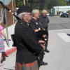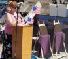 | Sid Hammond on bagpipes playing "Amazing Grace" to honor Charles Dwelley after the plaques' unveiling. | Granddaughter Judy Dawe addressing the crowd. | |